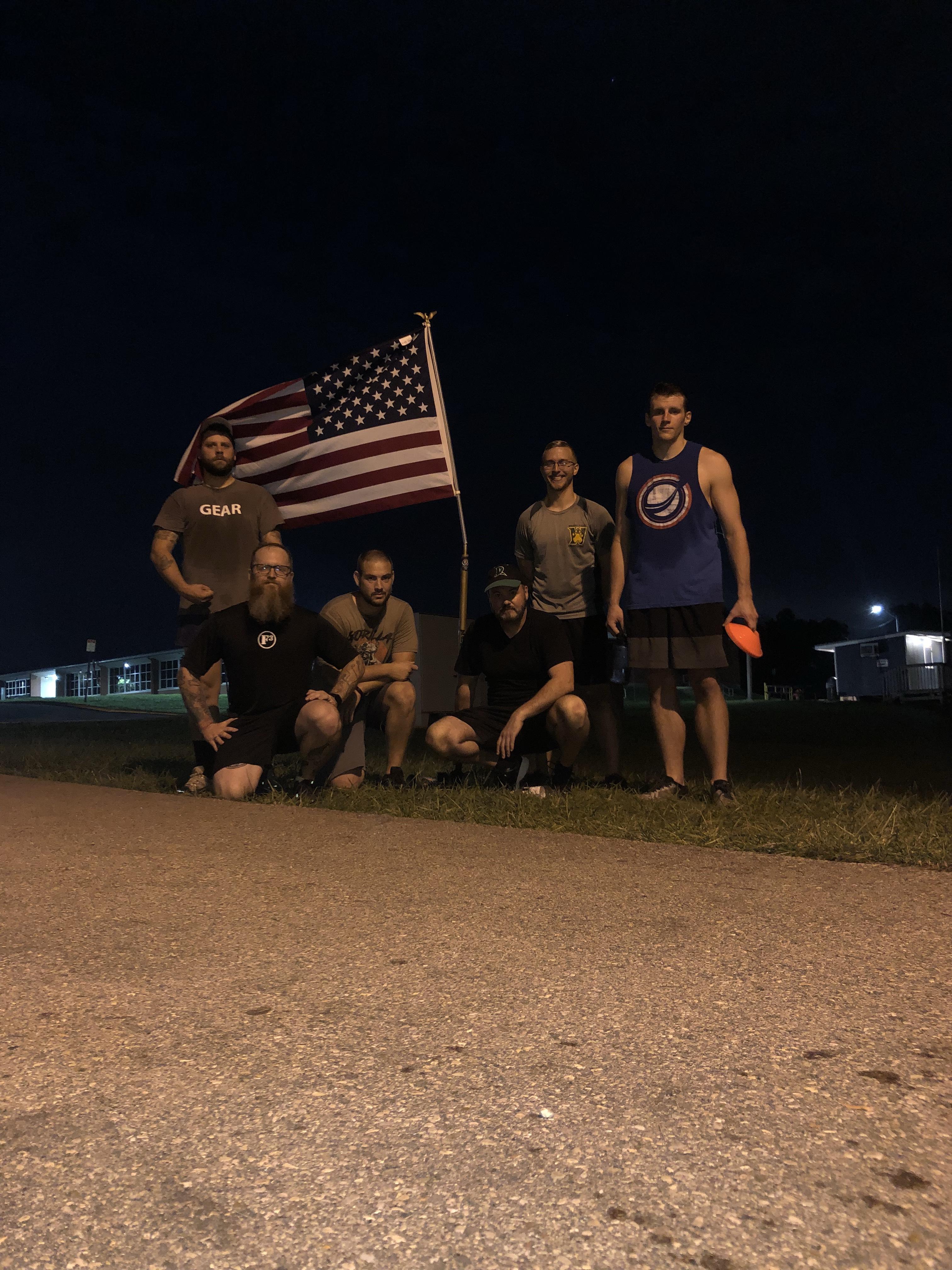 - Heading around the track all the Pax sprinted cone to cone alternating between Merkins, Lunges, and Leg Raises at each pole. Performed 30 reps of each exercise.