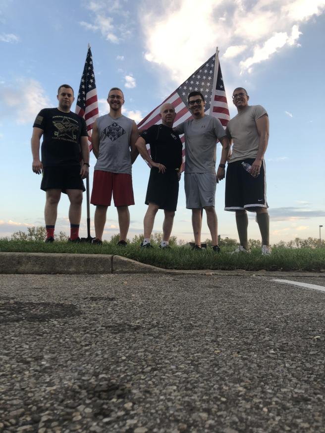 Circle burp (chop feet like football grass drills and PaX go in a circle calling out when to do a burpee)