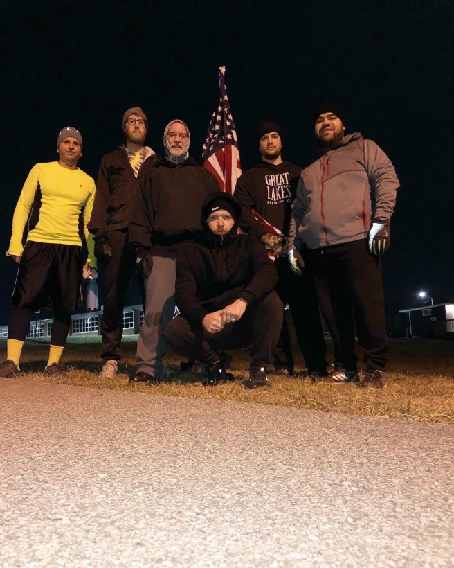 4 ct Burpees; 4 ct Merkins; 4 ct Sit-ups; 4 ct mtn climbers; 4 ct side straddle hops