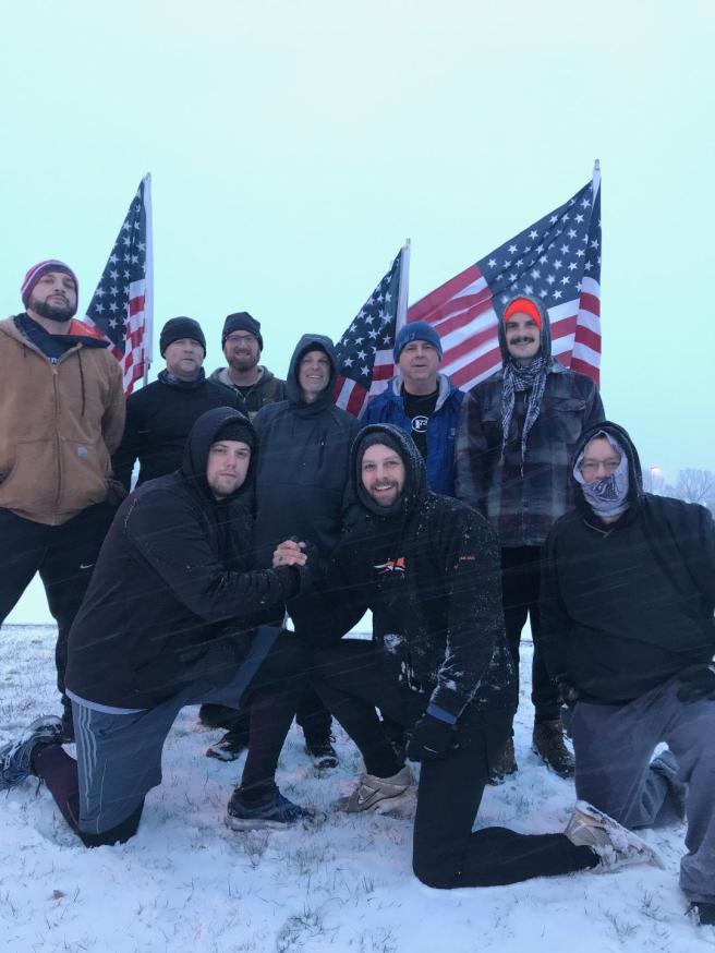 F3 Mission – To plant, grow and serve small workout groups for men for the invigoration of male community leadership. With that stated, we began to be invigorated with the help ofe the weather as the leading edge of a winter storm started passing only hours before. So at 26 degrees with snow in our face, we began warm ups in the parking lot.