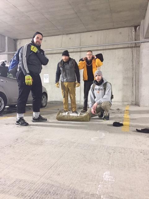 15 Cleans to OH Presses with Ruck, then wear Ruck and take turns carrying or tossing or dragging 60# bags thu snow. Summit 10’ tall steep snow banks and pull sandbags up and over using ropes.