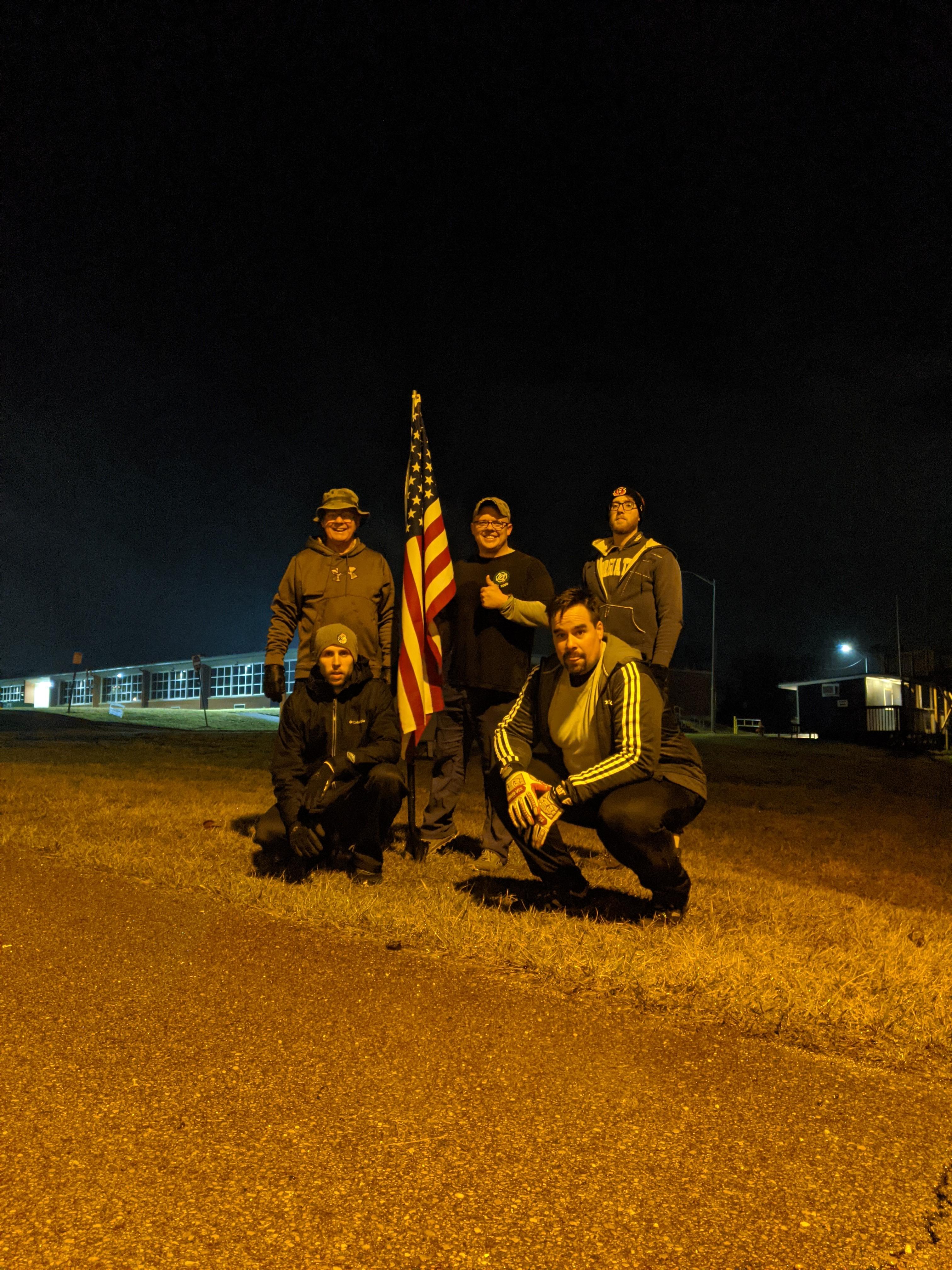 10 rounds of 3 burpees followed by 10 thrusters holding a cinder block.
