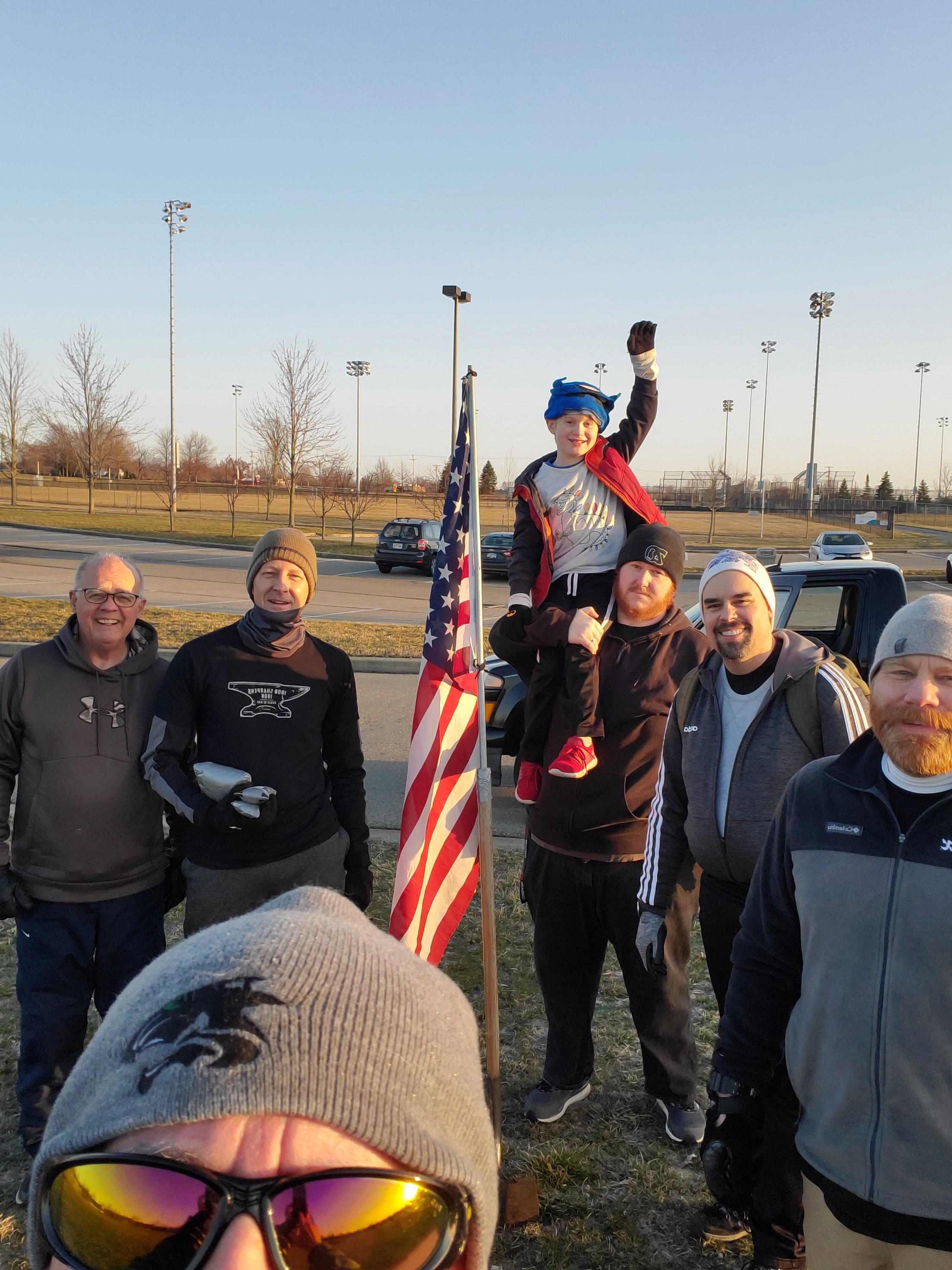 Pax 1 curls 2 – 25# DB (Dumb Bells) while walking lunge 20 yards Dun and Bradstreet (Down and Back). Upon return he joins the end of the circuit line which everyone else was performing during his absence