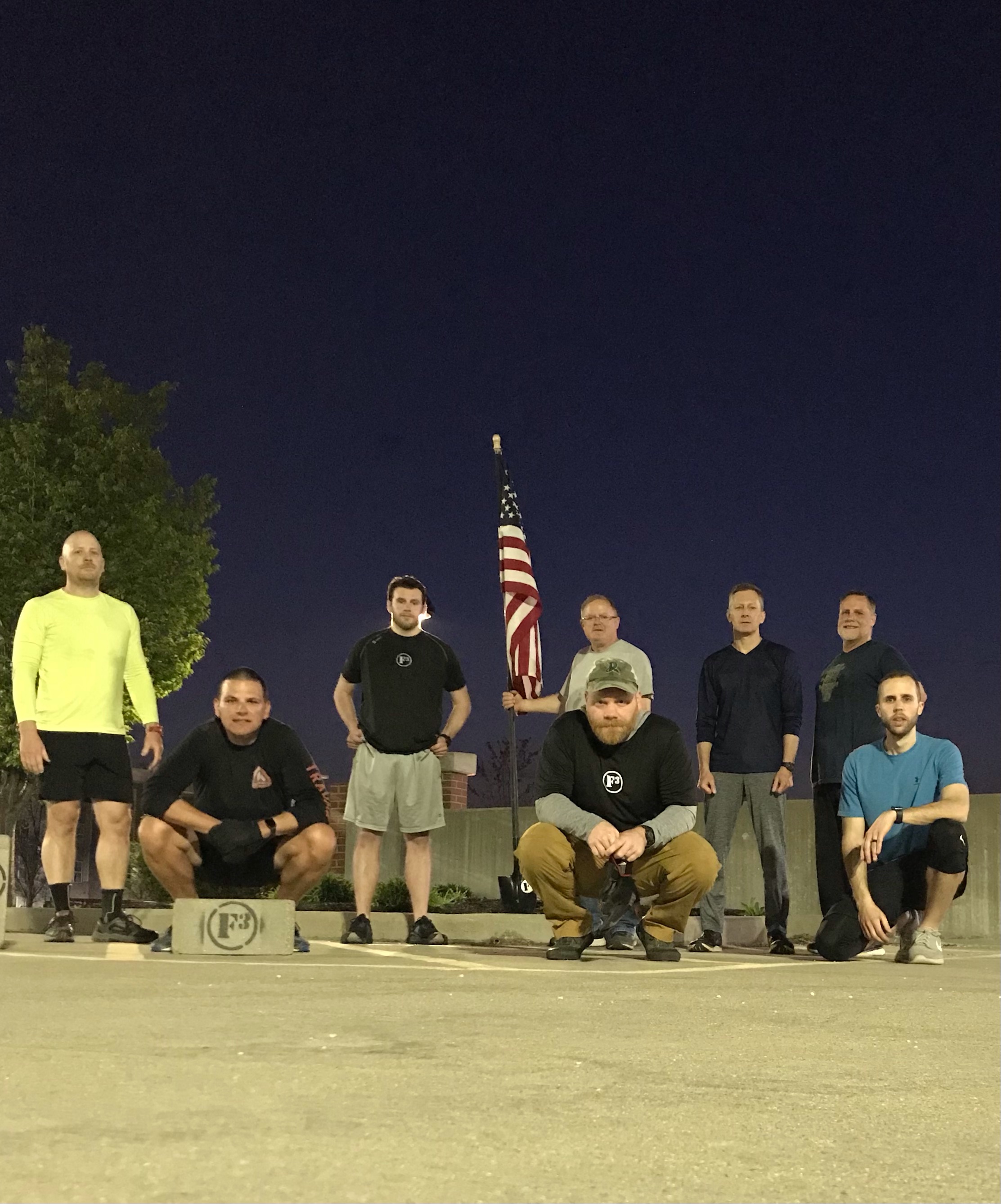 Each PAX takes a parking spot line. Perform exercise x 10, run to the middle of the next spots and back to your block, then take the block to the next parking spot and perform exercise x 10 again. So on for 4 total sets in each round. Round 1: Block Presses