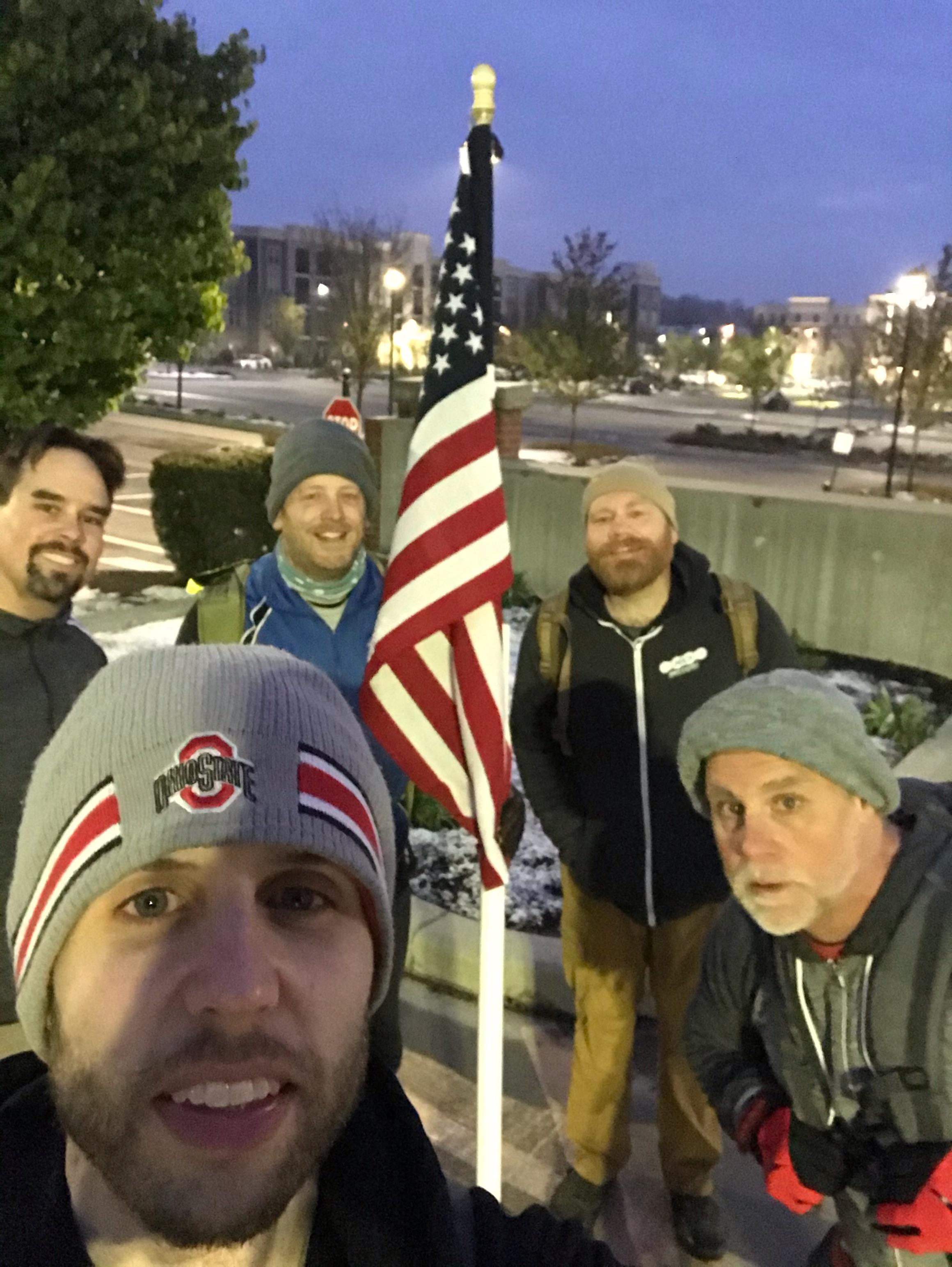 Stop 1 – Ruck Squats x 10 IC, Ruck Merkins x 10 IC, Ruck Clean and Press x 10 OYO