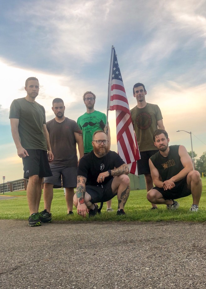 We moseyed over to the bottom of the hill leading to the upper half of Higgins. We performed 1 Burpee at bottom of hill, ran up hill, performed 2 Burpees, ran down the hill, performed 3 Burpees and so on and so forth until we reached 10 Burpees at the top of the hill. After short recovery, we worked our way back down starting with 9 Burpees at bottom of hill. Then we performed 1 extra Burpee for good measure. After all was said and done, we completed 9 runs up and down the hill and 101 Burpees!