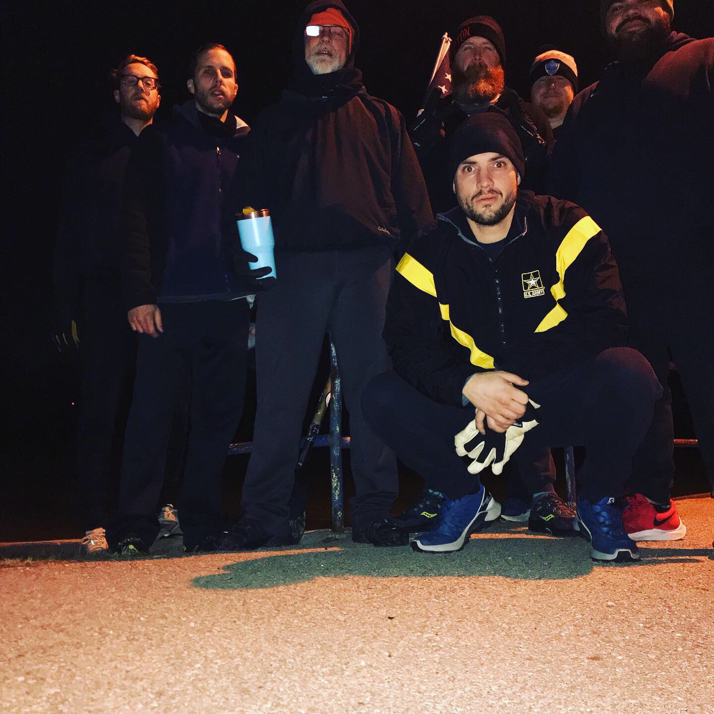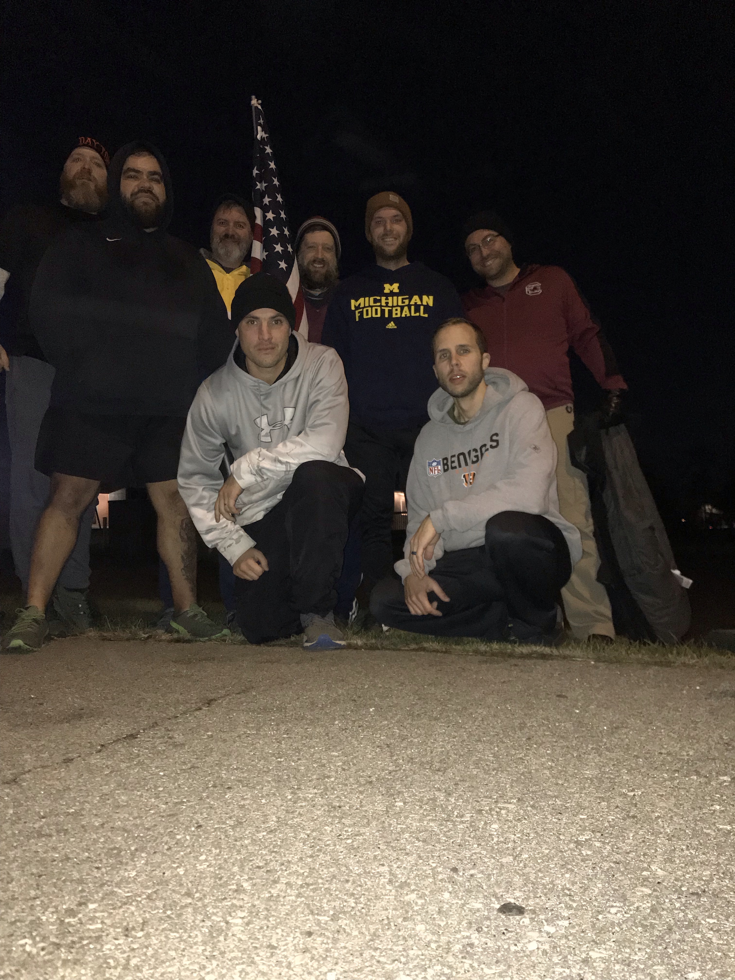 Stretch, Blocks , Suicide sprint 4 light poles with pre and post 10xMan makers; Suicide sprint 3 poles with pre and post 20x sit-ups ; suicide sprint 2 poles with pre and post 40x block squats.